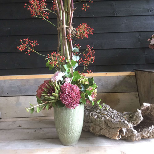 Graag maak ik voor u een stijlvol arrangement. Speciaal afgestemd op uw wensen waarin alles mogelijk is. Van een klein budget tot zelfs de aankleding van het geheel op locatie.